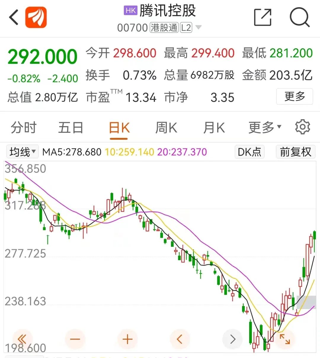 11月17日,腾讯控股收盘股价为292港元/股,自上月最低点大幅度反弹约48%。若按6600人计算,此次股权激励平均每人能获得41.4万港元,折合人民币37.8万元。