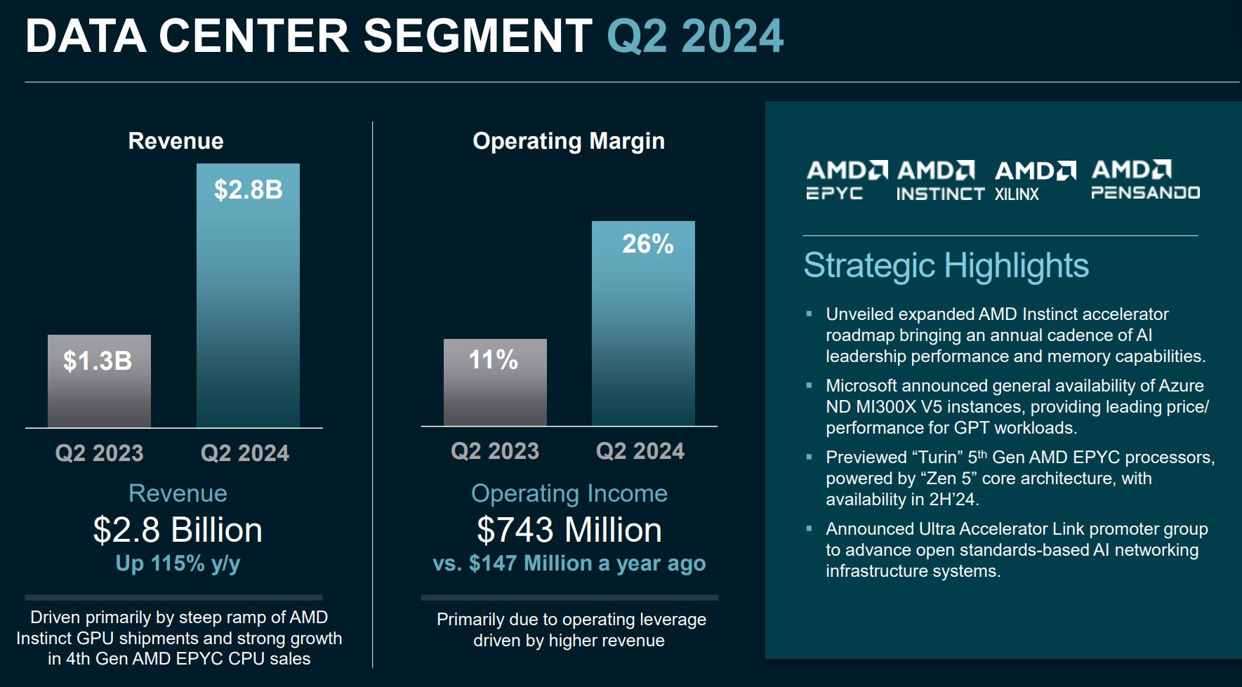 最初的利好发生在黎明破晓之前,美国AI芯片产业排名第二的超威半导体(AMD)在周三凌晨4时许发布了最新的财报。在核心财务数据均超预期同时,最受市场关注的数据中心部门收入翻番,达到创历史纪录的28亿美元。