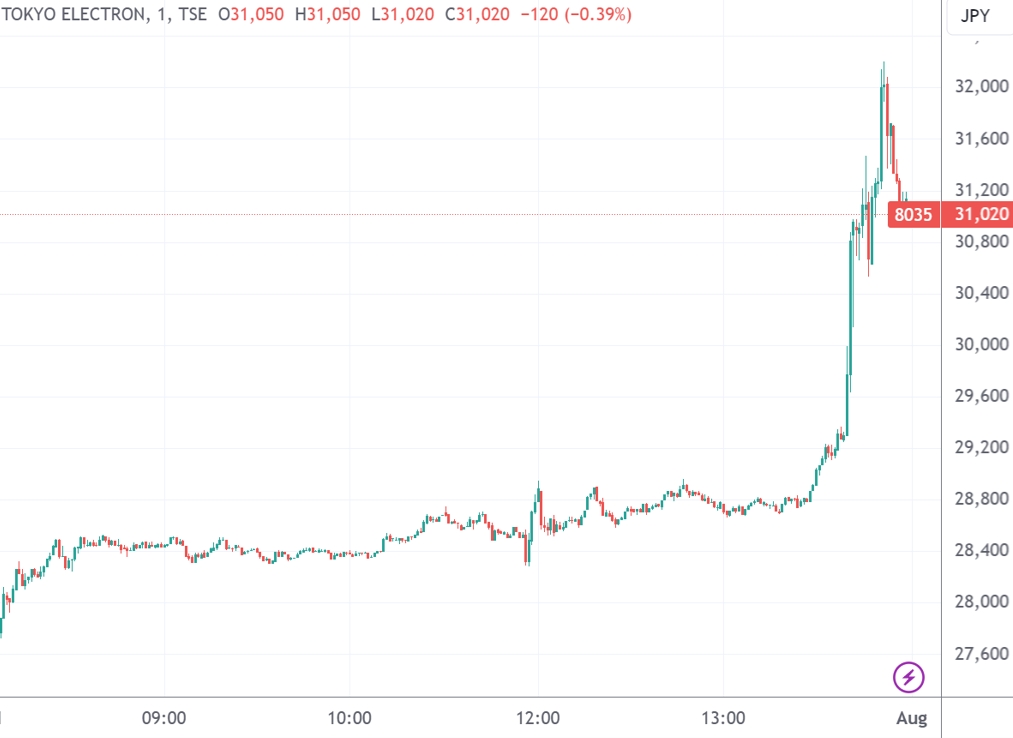 受此消息影响,东京电子尾盘快速拉涨,最终涨幅锁定在7.41%;半导体研磨设备制造商迪斯科涨5.80%、半导体封装和清洁设备制造商SCREEN控股涨9.19%。