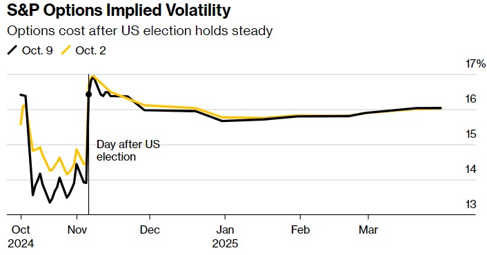 与此同时,与去年相比,美国股票期权波动率相对较高,表明交易员正采取防御姿态。但衍生品专业人士说,几乎没有迹象表明这主要是因为选举。相反,期权交易主要受到近期催化剂的推动,如经济数据报告、亚洲市场的高度波动和地缘政治紧张局势。