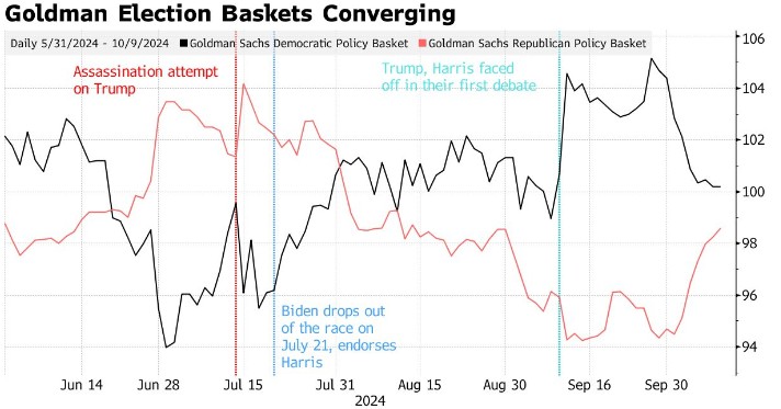 能源是另一个受欢迎的选举交易,特朗普获胜被认为对传统能源生产商有利,而哈里斯当选则被认为对清洁能源行业有利。高盛追踪与民主党和共和党胜利相关投资的两个指数,显示出不同行业对竞选活动的反应。