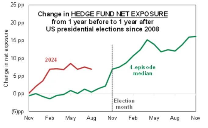 智通财经获悉,高盛自2008年以来的大宗经纪数据显示,对冲基金并没有像以往那样在大选前减持股票,相反,随着标普500指数继续创出纪录,对冲基金增加了对股票的敞口。与此同时,期权交易员更关注美联储的降息和美国经济的健康状况,市场资深人士表示,11月5日的大选投票在当前优先事项的列表中排名较低。