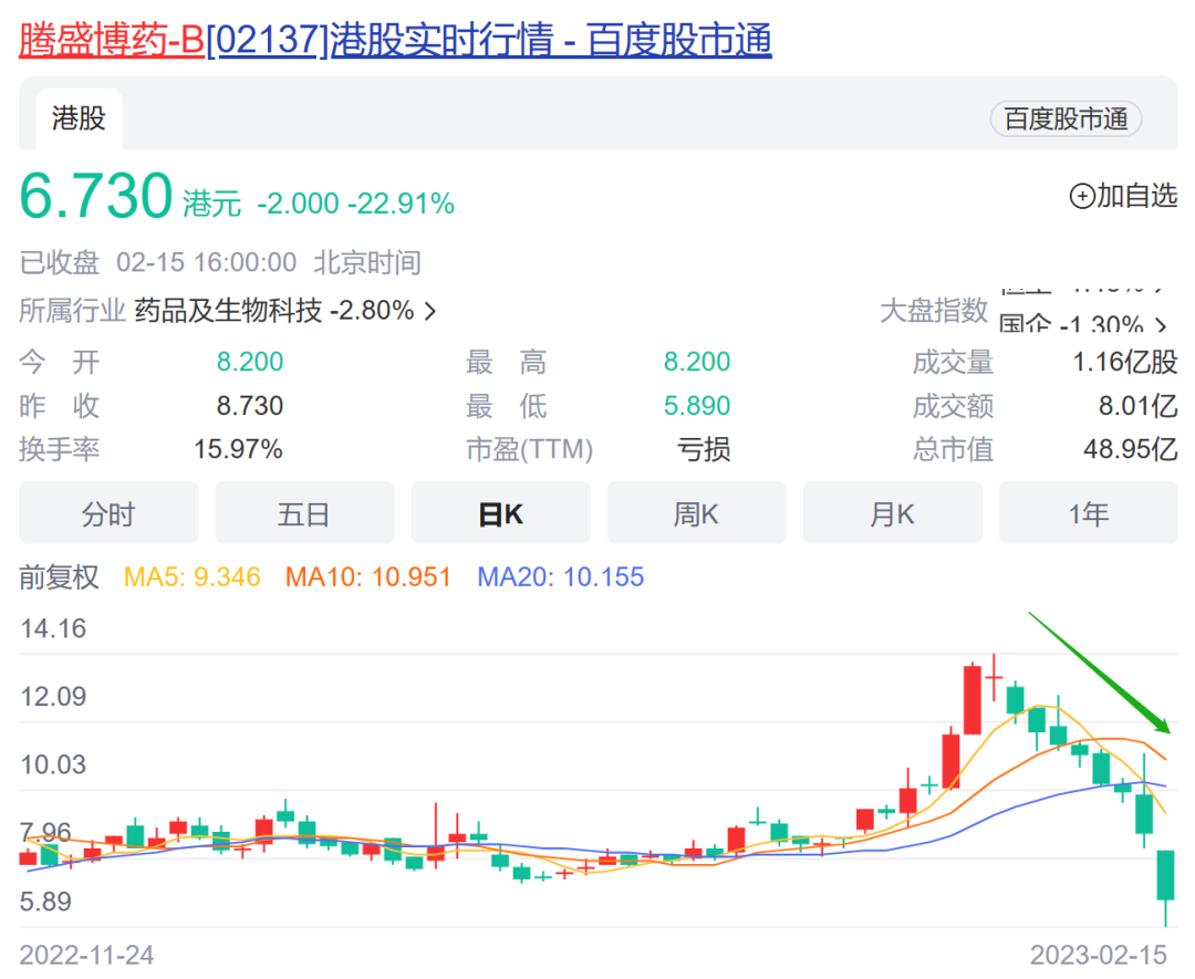 2月15日,港股公司腾盛博药-B单日大跌近23%,盘中曾一度跌超32%。这是该股近期录得的连续第八根阴线,累计跌幅达50%。