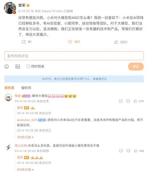 值得一提的是,小米创始人雷军对大模型态度也颇为积极。4月14日晚间,他在微博发文称,小米在AI领域已经耕耘多年,有AI实验室、小爱同学、自动驾驶等团队。“对于大模型,我们当然会全力以赴,坚决拥抱。我们正在研发一些有趣的技术和产品,等我们打磨好了,再给大家展示。”