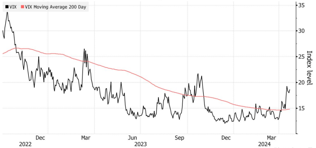 有报道称中东紧张局势升级后,加之投资者们对美联储将在未来几个月转向降息的信心不断减弱,导致波动性激增。随着美国股市年初创下历史新高,VIX指数连续数月处于低位。自四月初以来,VIX指数不断升高。有望连续12个交易日收于200日均线之上,这是自2022年10月以来最长的一次。