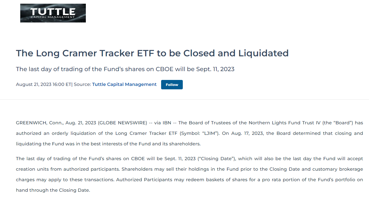 虽然外界对于克莱姆的调侃久已有之,但与他荐股有关的金融产品却在今年才出现在美股市场里。今年3月,Tuttle Capital同时推出了追踪做多克莱姆ETF和反向追踪克莱姆ETF。操作上大致可以归纳为,前者是根据克莱姆的公开建议买卖股票,后者则是抛出克莱姆推荐的股票,并买入他看空的股票。