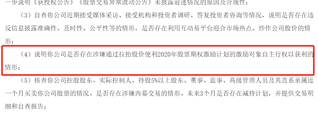 对于在行权期后释放利好,公司是否存在拉台股价的嫌疑。在关注函中,深交所问的非常直接,要求公司说明是否存在涉嫌通过拉抬股价便利2020年股票期权激励计划的激励对象自主行权以获利的情形。对于这一灵魂拷问,深交所要求在11月26日前对外披露。不过,截止最新,上市公司仍未对上述情况进行回复。
