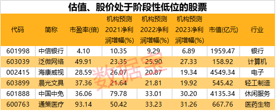通常股价接近低位时,下跌的阻力会较大,资金博弈配合良好的发展态势之下,当估值也处于相对低位之时,或存在上涨的潜力。数据宝统计显示,上述35股中,本周估值创年内最低的仅有6只,分别是中信银行、泛微网络、海康威视、晨光文具、中国中免及通策医疗,估值低于30倍的有中信银行及海康威视,海康威视估值不到29倍,年内最高估值超过50倍。