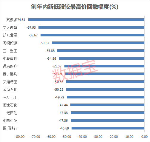 以年内最高价与最低收盘价对比来看,上述35股平均回撤43%,回撤30%以上个股占比近八成,50%以上的多达10家,嘉凯城、学大教育、蓝光发展3股回撤65%以上。嘉凯城今年2月26日最高价为年内最高,达到9.14元,11月22日收盘价2.34元,回撤幅度接近75%。7只千亿市值股平均回撤41.4%,三一重工、荣盛石化、中国中免回撤幅度最大,前2股超50%,中国中免接近腰斩。
