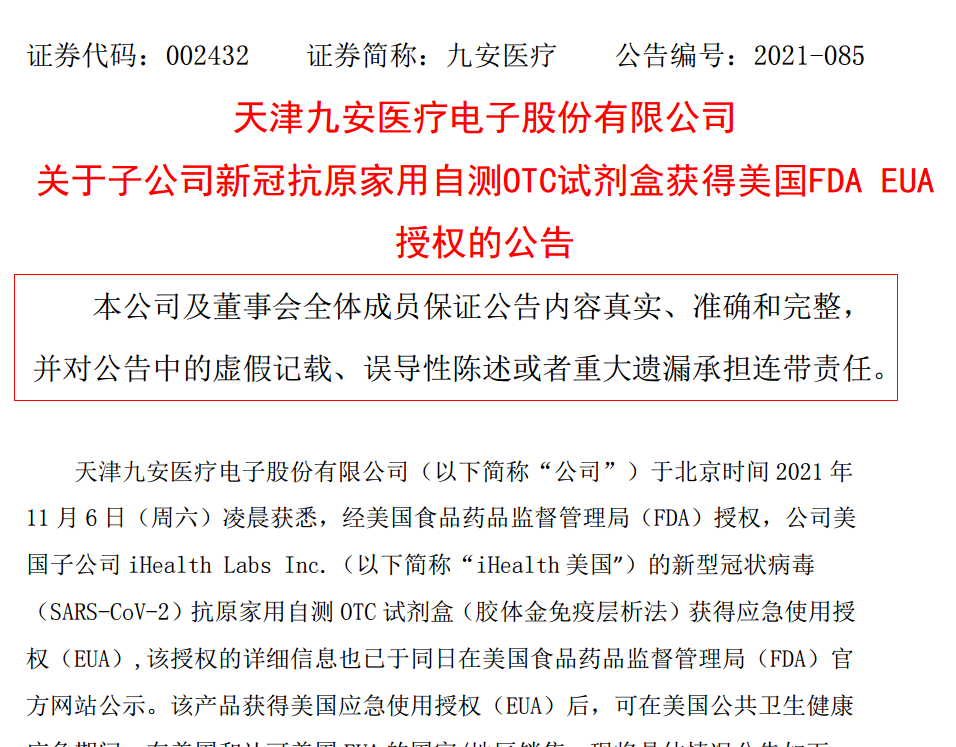 九安医疗的飙涨,早在11月8日就开始了,而这与11月7日晚公司的一份公告是密切相关的。九安医疗公告,子公司家用新冠自测试剂盒已获得美国食品药品监督管理局(FDA)应急使用授权(EUA),可在美国和认可美国EUA的国家/地区销售。在此公告发布后的3个交易日,市场表现平平。