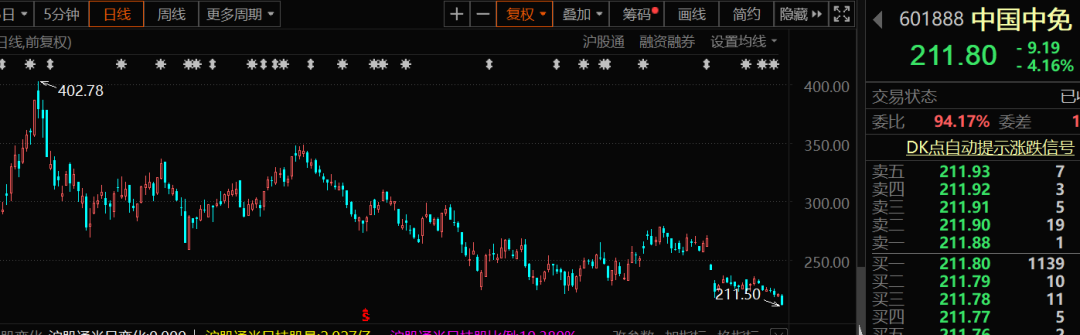 近3个交易日收盘价创年内最低的有泛微网络、宇通客车、苏宁易购、中国中免等,作为中国最大的免税店龙头,中国中免11月25日收盘价211.8元,受业绩不及预期以及其它原因的拖累,公司自2月中旬股价创历史新高以来一路震荡走低。