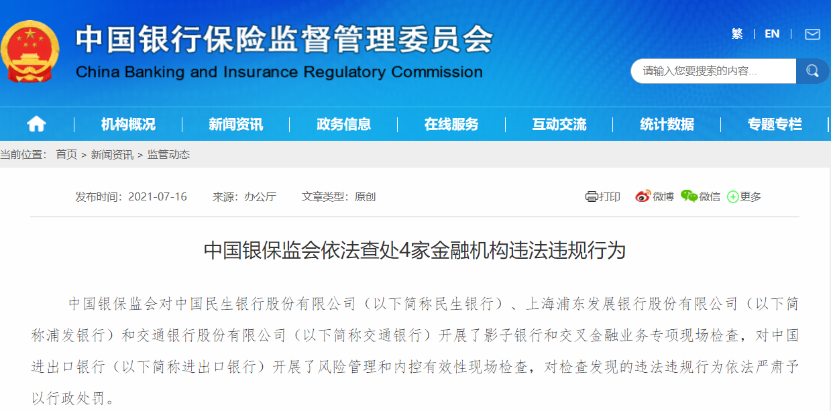 银保监会网站7月16日消息,银保监会对民生银行、浦发银行、交通银行开展了影子银行和交叉金融业务专项现场检查,对进出口银行开展了风险管理和内控有效性现场检查,对检查发现的违法违规行为依法严肃予以行政处罚。