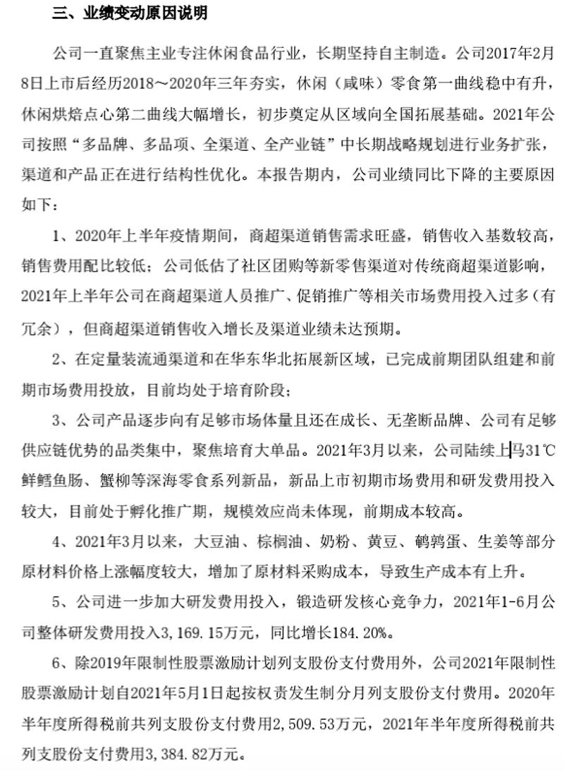 对于业绩下滑,盐津铺子具体列举了6方面的原因。