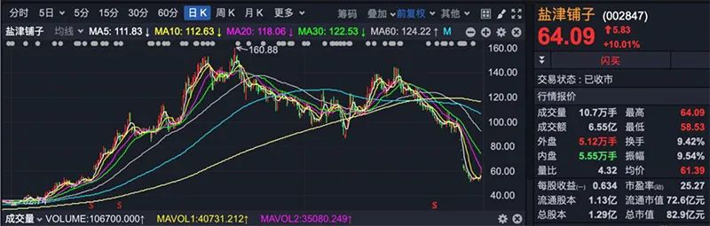 盐津铺子业绩预告显示,今年上半年其归属于上市公司股东的净利润为4500万元~5500万元,同比下滑57.68% ~65.38%。由于业绩大幅低于预期,盐津铺子随后遭遇大跌。