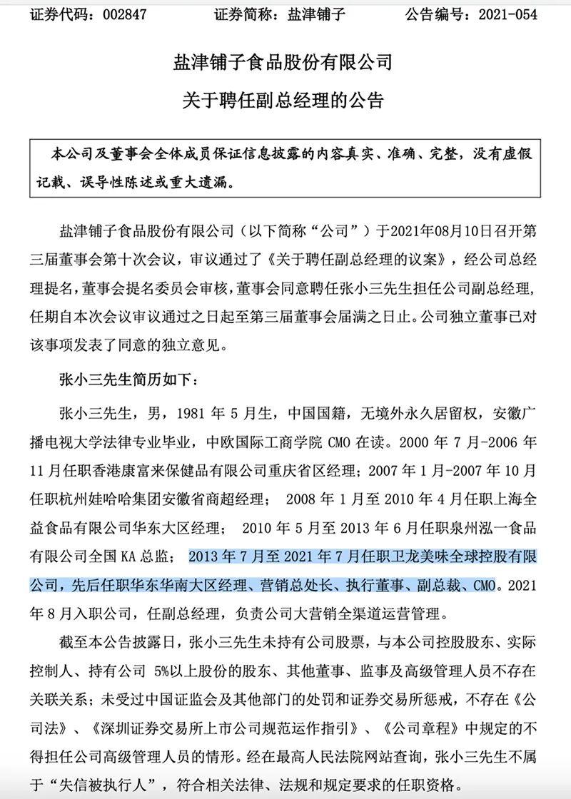 公告显示,张小三2021年8月入职盐津铺子,任副总经理,负责盐津铺子大营销全渠道运营管理。