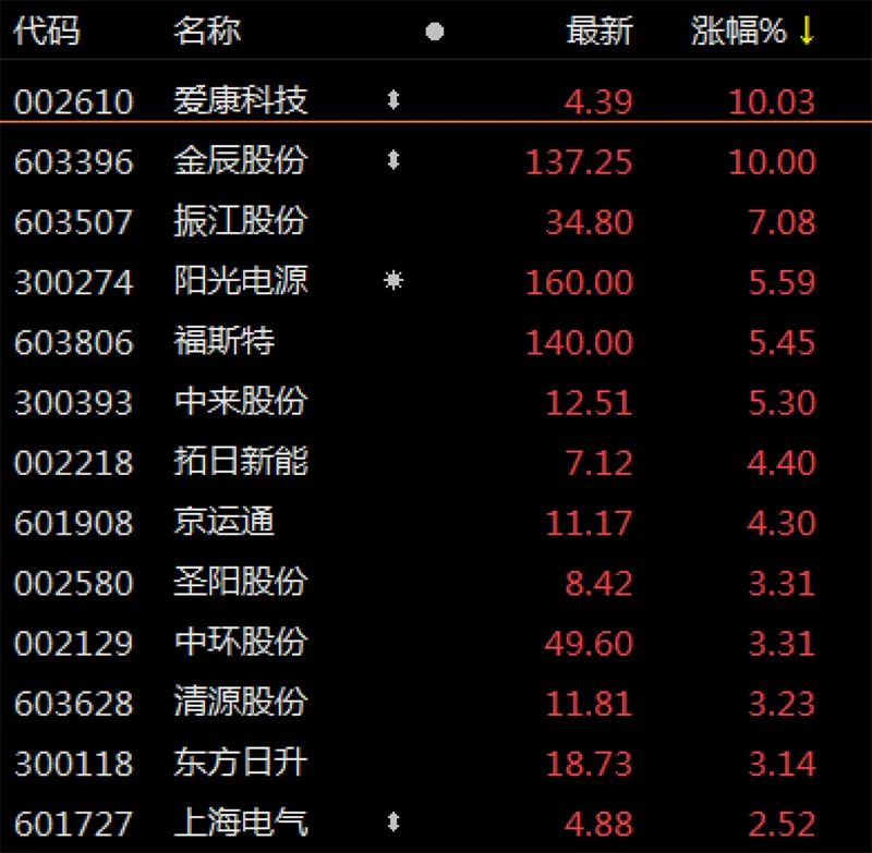 光伏板块延续强势,金辰股份连续两日涨停。阳光能源、福斯特、中来股份涨超5%。风电板块快速拉升,明阳智能涨停,运达股份、金雷股份涨超7%。
