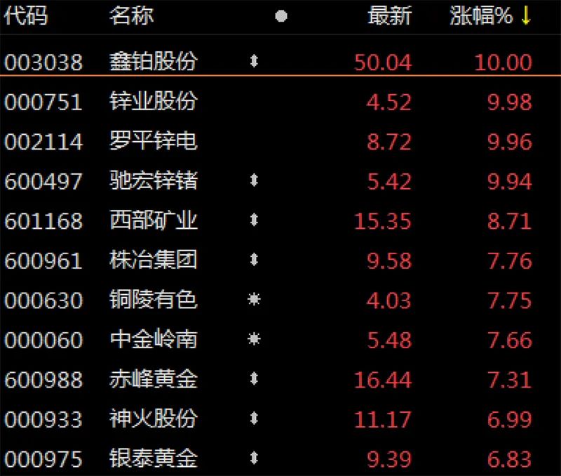 今日早盘,有色金属板块大幅反弹,鑫铂股份、锌业股份、罗平锌电涨停,西部矿业、株冶集团、铜陵有色涨超7%。
