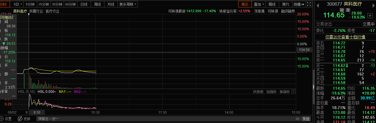 今日早盘,英科医疗开盘大跌,盘中一度跌停。截至发稿,该股报114.65元,跌幅达19.63%。与此同时,英科转债也跟随正股下挫,跌幅亦超过17%。