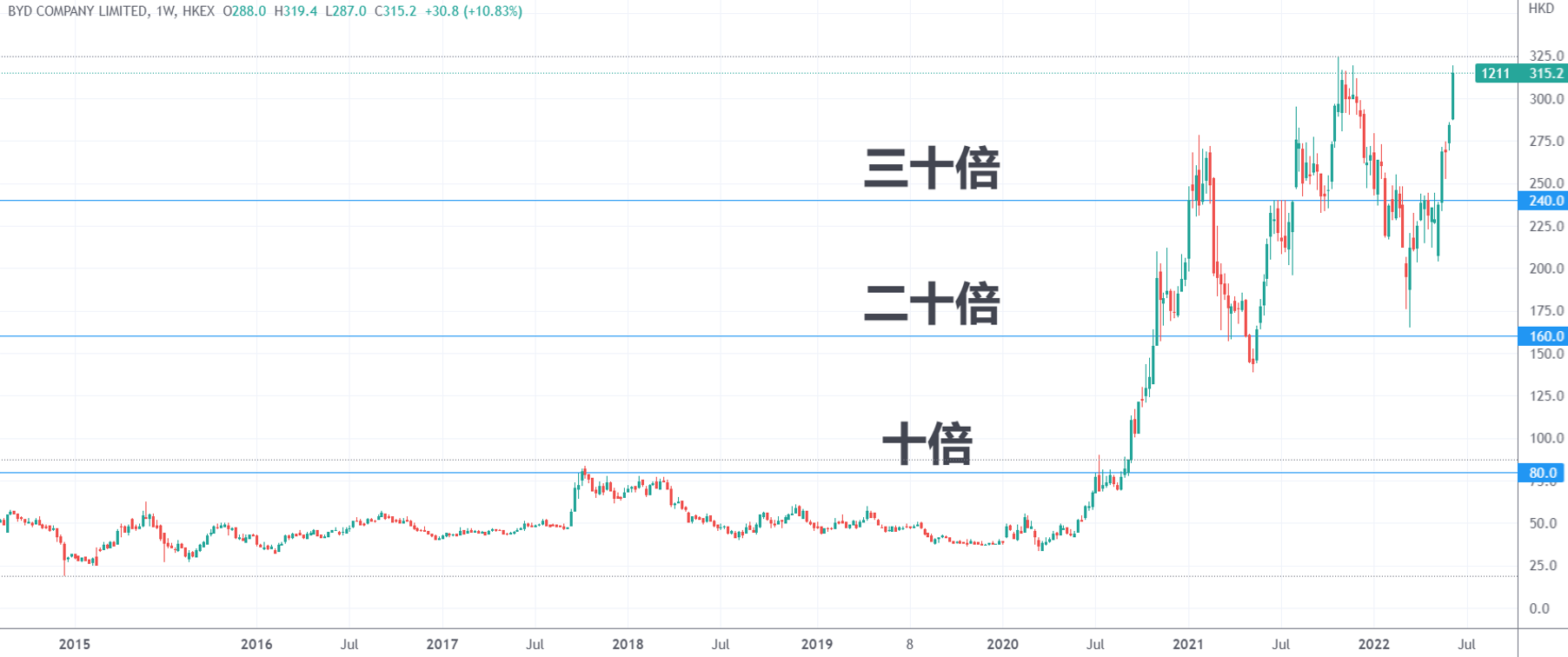 在芒格说这番话的时候,比亚迪港股的价格大约在260-270港元左右,时隔两个月就接近腰斩至140港元。就在大多投机者追涨杀跌的过程中,持股巍然不动的股神们又等到公司重回风口的高光时刻。
