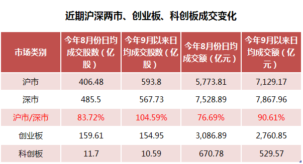 此外,值得注意的是,作为“科技”“创新”“新经济”企业比较集中的创业板和科创板,9月以来日均成交额出现减少,其中创业板日均成交额较8月份下降超过一成,科创板日均成交额较8月份下降超过两成。上述成交变化数据,从另一侧面充分反映了近段时间市场正在发生的微妙变化。