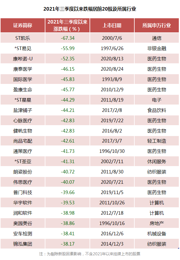 与此同时,三季度以来也有多只个股跌势惨烈,跌幅最大的股票主要集中在医药生物等昔日的热门行业。