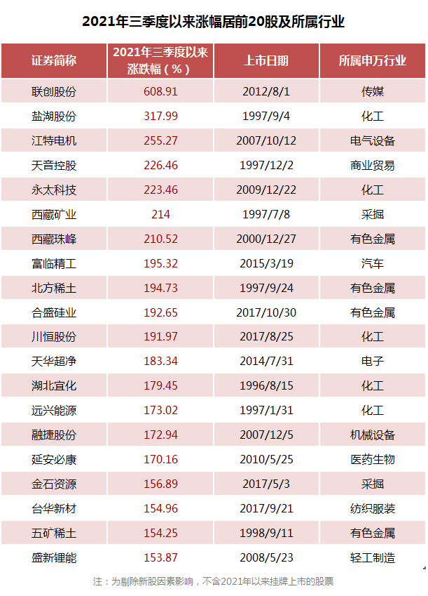 从具体个股来看,在剔除今年上市的新股后,三季度以来出现多只翻倍股,主要集中在化工、有色金属等传统行业。