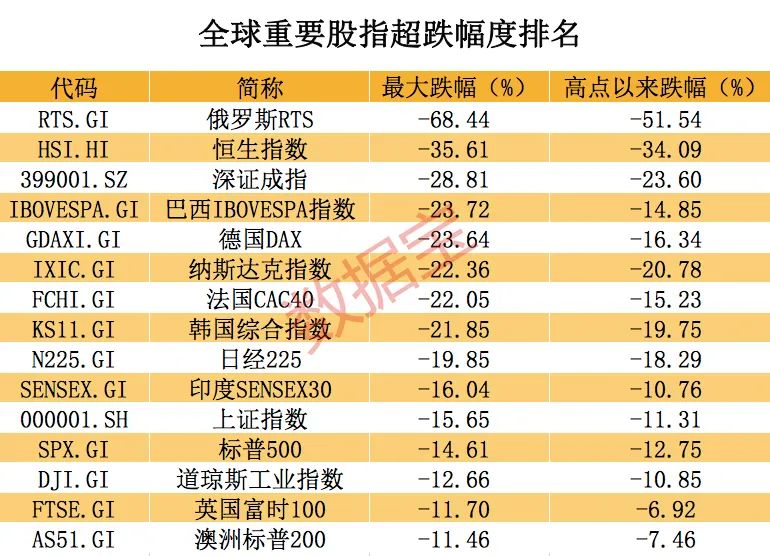 在地缘政治风险、美联储加息预期等因素综合影响,全球股市近期大幅回落。证券时报·数据宝粗略统计,全球已经有50多个股指去年以来最大跌幅超过20%。全球重要指数方面,俄罗斯RTS、恒生指数、深证成指、巴西IBOVESPA指数等股指去年以来最大跌幅均超过20%,俄罗斯RTS最为惨烈,最大跌幅超过68%。
