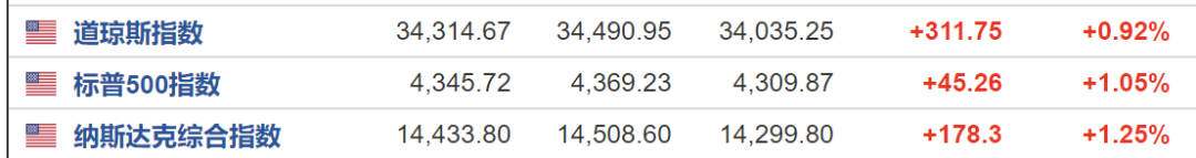 截至收盘,道琼斯指数涨0.92%,报34,314.67点;标普500指数涨1.05%,报4,345.72点;纳斯达克综合指数涨1.25%,报14,433.80点。