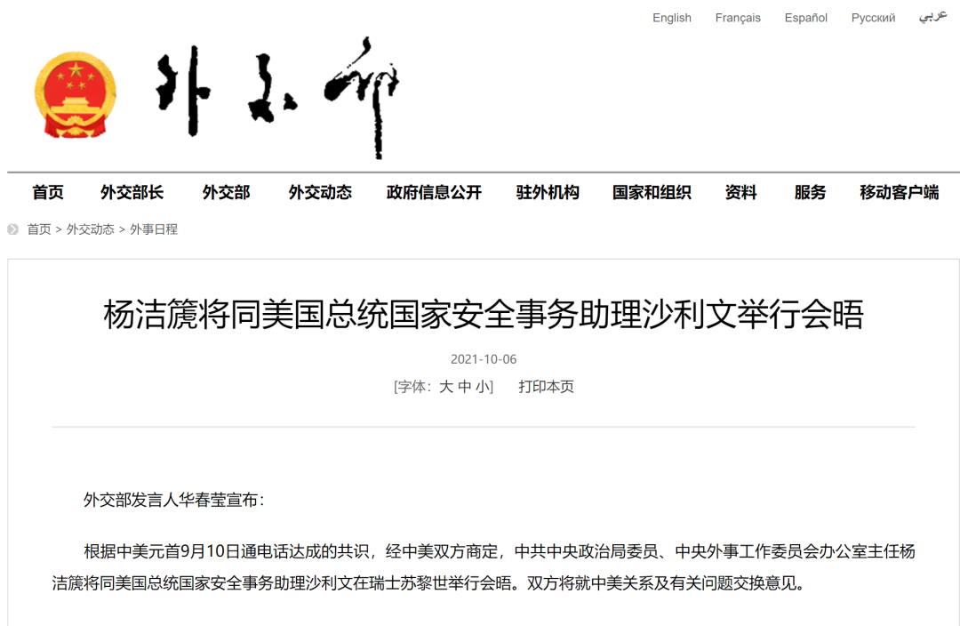 新华社消息,外交部发言人华春莹6日宣布:根据中美元首9月10日通电话达成的共识,经中美双方商定,中共中央政治局委员、中央外事工作委员会办公室主任杨洁篪将同美国总统国家安全事务助理沙利文在瑞士苏黎世举行会晤。双方将就中美关系及有关问题交换意见。