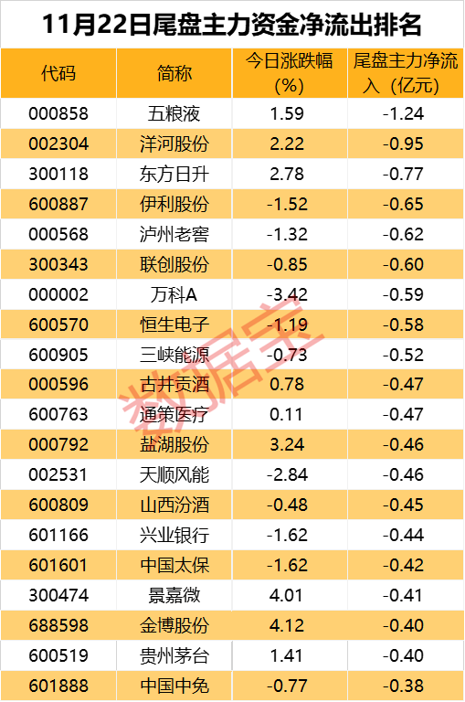 泸州老窖、伊利股份、东方日升、洋河股份、五粮液的尾盘资金净流出额居前。