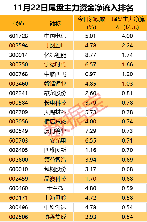 数据宝统计个股方面,中国电信的尾盘主力资金净流入额最大,为4亿元,股价尾盘拉升5%。比亚迪次之,尾盘资金净流入2.24亿元。亿纬锂能、宁德时代、中航西飞、赣锋锂业的尾盘主力资金净流入额均超过亿元。