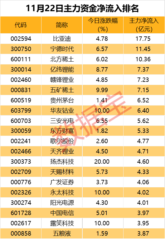 证券时报·数据宝统计显示,比亚迪获主力资金净流入额最多,加仓17.75亿元,宁德时代次之,获11.45亿元主力资金加仓。今日A股盘面,半导体、汽车、锂电池板块走势强劲,宁德时代涨6.57%,股价最高到681元,再创历史新高。消息面上,近期锂矿行业景气度进一步提升,锂精矿价格上涨明显,对锂盐产品构成了明显的成本支撑。中信证券认为,2022年锂供应紧张的局面或无法缓解,预计锂价保持上涨趋势。北方稀土、亿纬锂能、赣锋锂业、五矿稀土、贵州茅台、华友钴业等股今日的主力资金净流入额居前。