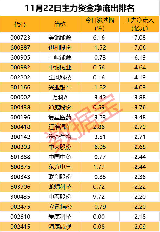 主力资金净流出超亿元的共有79股,美锦能源、伊利股份、三峡能源的主力净流出规模居前,分别流出7.08亿元、7.06亿元、6.19亿元。