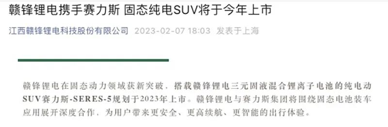 消息面上,赣锋锂业控股子公司赣锋锂电宣布在固态电池上获新突破,赣锋锂电与赛力斯集团将围绕固态电池装车应用展开深度合作,搭载赣锋锂电三元固液混合锂离子电池的纯电动SUV赛力斯-SERES-5规划于2023年上市。