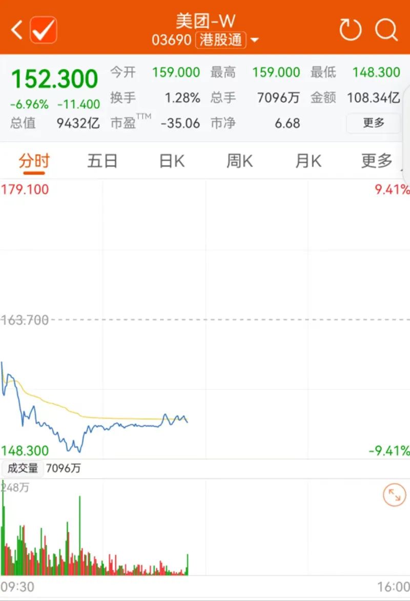 今日早盘,美团-W股价低开后迅速下挫,盘中一度跌超9%,跌破150港元。截至午间,美团股价报152.3港元,下跌6.96%,领跌恒生科技指数成分股。