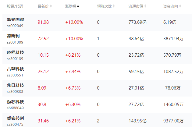 除此以外,英伟达业绩的效应也带动了整个亚洲半导体芯片板块大面积的反弹。日内,A股半导体芯片板块也整体走高,其中紫光国微、德明利双双涨停,晓程科技收涨超8%,古鳌科技涨7.4%,兆日科技、炬芯科技、香农芯创涨逾6%。