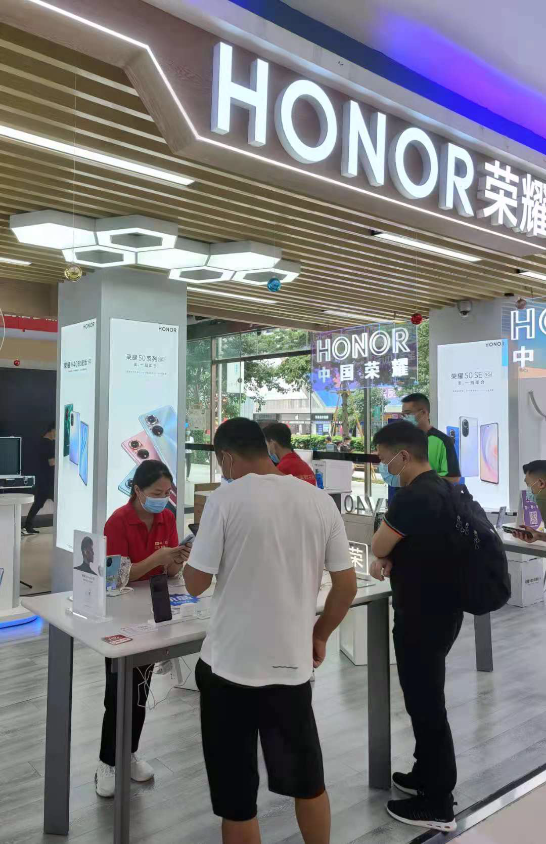 从线下市场来看,截至发稿时,荣耀暂未公布销售数据。6月25日下午,中国证券报记者前往国美华强北门店实地探访发现,在荣耀档口,不断有消费者前来体验咨询荣耀50系列手机。