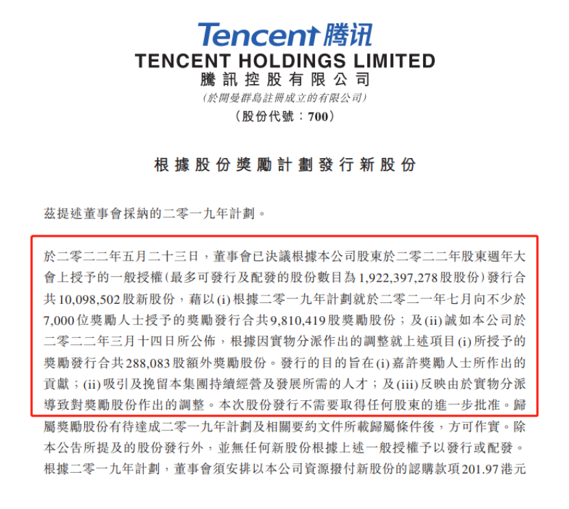 5月23日,腾讯公告,董事会决议根据公司股东于2022年股东周年大会上授予的一般授权发行合共1009.85万股新股份,授予不少于7000位获得奖励的人士。以5月23日收盘价346.8港元/股计算,授予股份合计总价值35亿港元。
