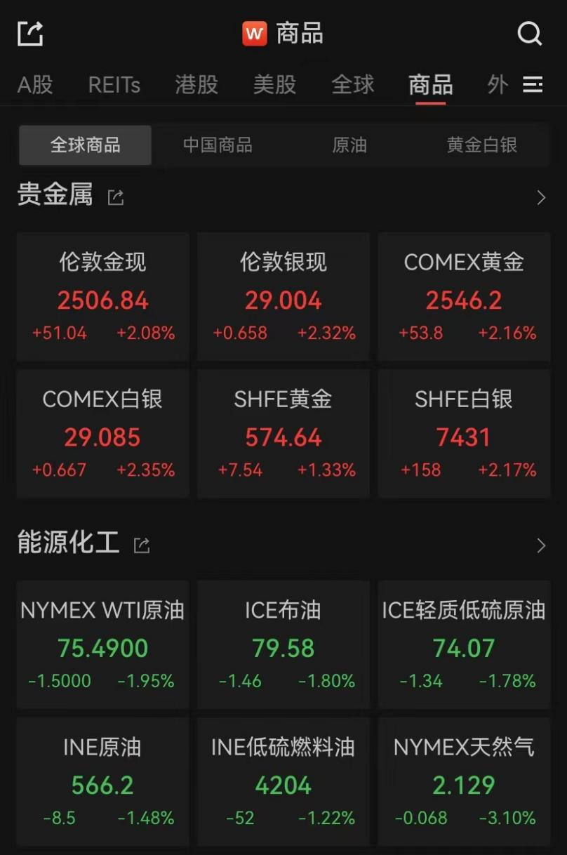 截至收盘,伦敦现货黄金报2506.84美元/盎司,涨2.08%,最高至2509.72美元/盎司,创历史新高;伦敦现货白银价格报29.004美元/盎司,涨2.32%。COMEX黄金期货涨2.16%报2546.2美元/盎司,创历史新高,COMEX白银期货涨2.35%报29.085美元/盎司。