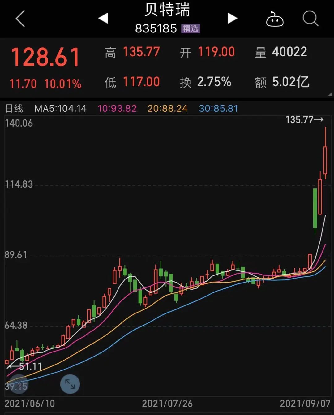 今日新三板精选层个股贝特瑞再度大涨,公司总市值突破600亿元,成为新三板市场首只总市值破600亿股票。交易行情显示,贝特瑞9月7日高开1.79%,开盘后公司股价不断上探,盘中一度涨超16%。截至收盘,贝特瑞股价128.61元/股,涨幅10.01%,总市值为624亿元。