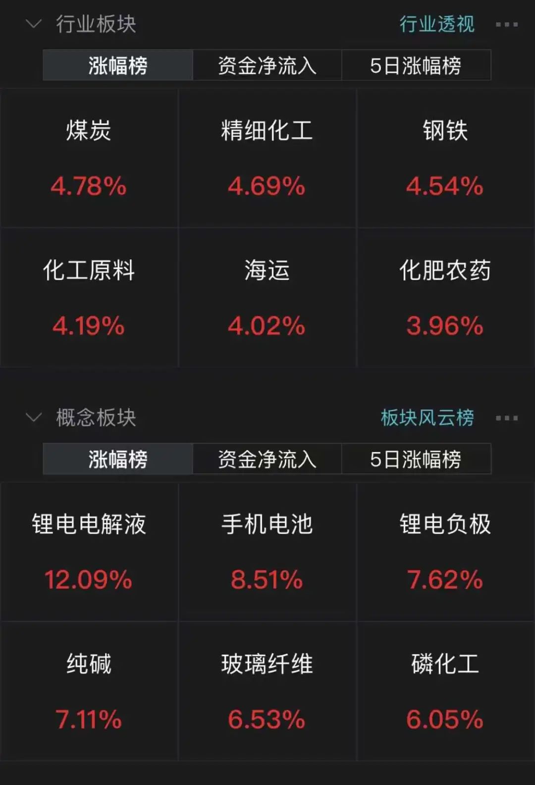 今日各大指数全线上扬,上证指数大涨1.53%,创半年多来新高。短短调整数日之后,资源股行情再度井喷。近期,周期板块可谓风头出尽。截至收盘,钢铁、化工、采掘、有色金属等板块均涨逾4%。概念方面,氟化工、PVDF概念、磷化工、钴等概念大幅上涨。与新能源密切相关的资源股,无疑是本轮周期股行情的领头羊,包括氟+磷+硅+锂+稀土等细分资源股,均出现大幅飙涨行情。