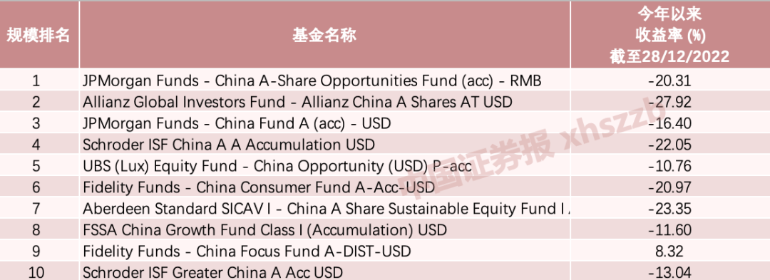 在前十大海外中国股票基金中,9只基金收益率告负,多只产品亏逾20%,其中便包括目前规模最大的摩根基金-中国A股机遇A(累计)人民币。