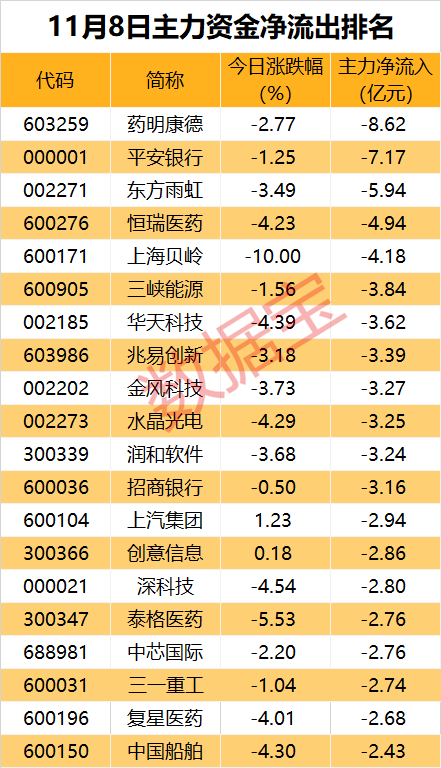 数据宝统计显示,主力资金净流出超亿元的共有69股,药明康德、平安银行、东方雨虹的主力资金净流出规模居前三位,分别流出8.62亿元、7.17亿元和5.94亿元。上海贝岭尾盘跌停,主力净流出4.18亿元。