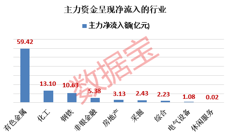 数据宝统计,有色金属行业资金流入居首,净流入59.32亿元。化工行业和钢铁行业的主力资金净流入额均超过10亿元。
