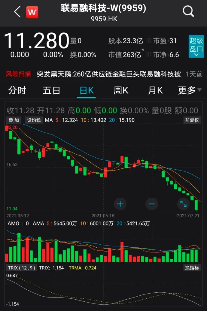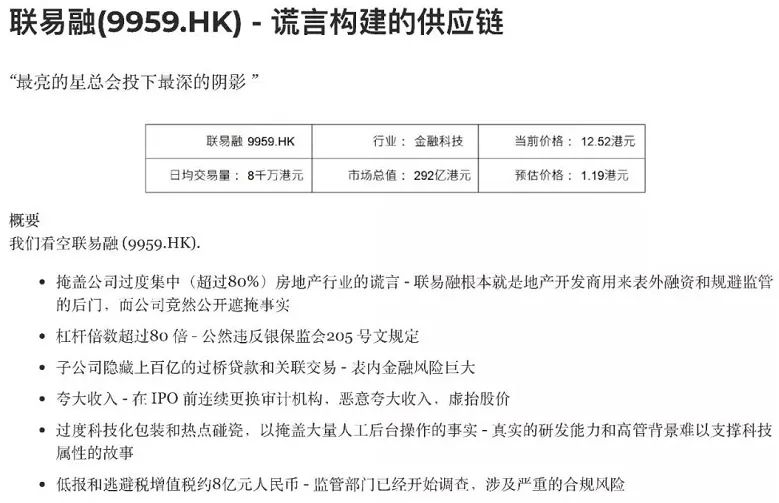 在Valiant Varriors的“狙击”下,联易融科技股价迅速下跌近10%。当天下午,联易融科技紧急宣布短暂停牌。