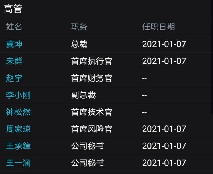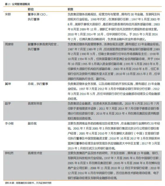 在高管团队方面,董事长兼CEO宋群、首席财务官赵宇均来自腾讯集团。其中,宋群于2015年3月至2016年2月期间,任腾讯集团战略顾问,负责就金融科技业务提供建议;赵宇在2016年8月至2019年4月在腾讯集团投资并购部担任高级投资经理。