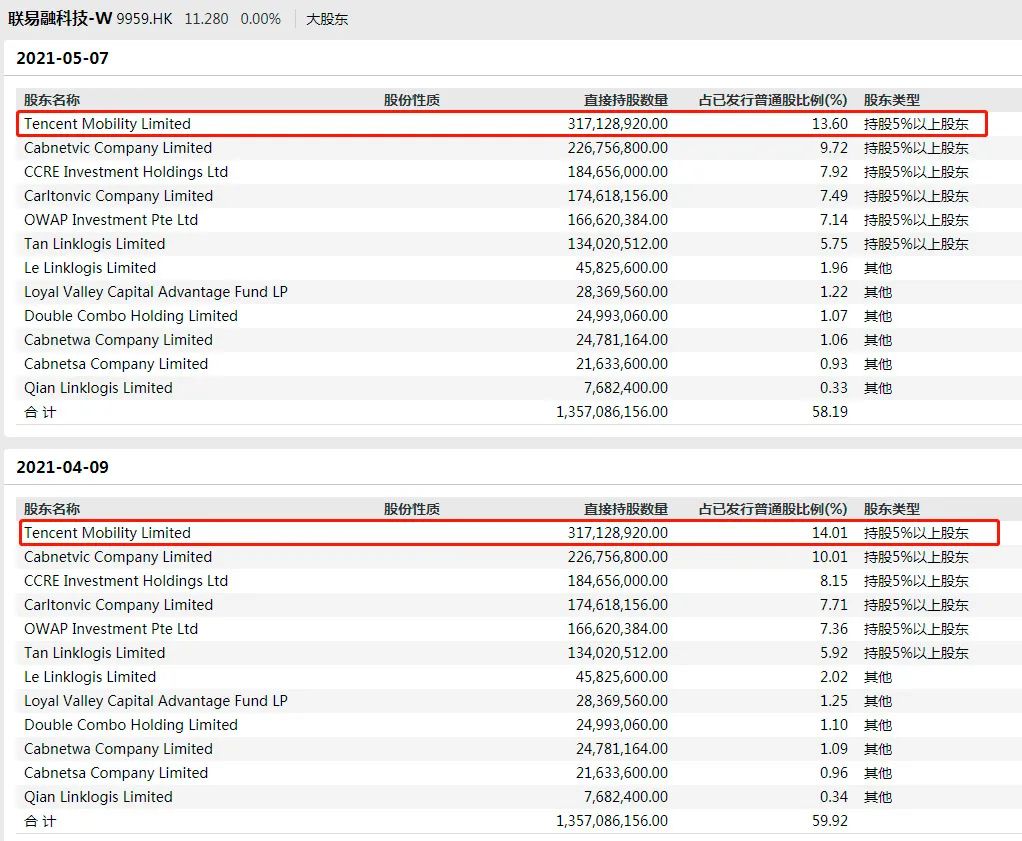 根据其港股上市招股书,在机构股东方面,腾讯持有联易融科技15.11%的股份,尽管这几年腾讯在持股比例上略有变化,但仍为其最大的机构股东。