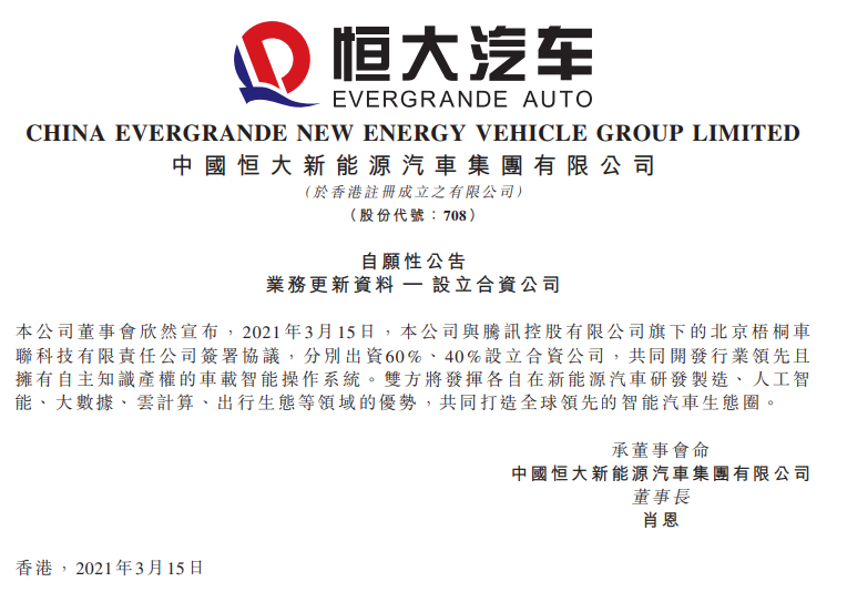 3月15日,许家印旗下恒大汽车在港交所发布公告,公司与腾讯旗下梧桐车联签署协议成立合资公司,共同开发拥有自主知识产权的车载智能操作系统。其中,恒大汽车持有合资公司60%股权;梧桐车联持有合资公司40%股权。