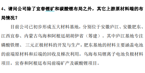 国轩高科此前透露,目前已初步形成五大材料基地,分别位于安徽庐江、安徽肥东、江西宜春、内蒙古乌海和阿根廷胡胡伊省(筹建)。公司将加快推进宜春碳酸锂项目,力争早日满产,满足公司动力电池生产需求。