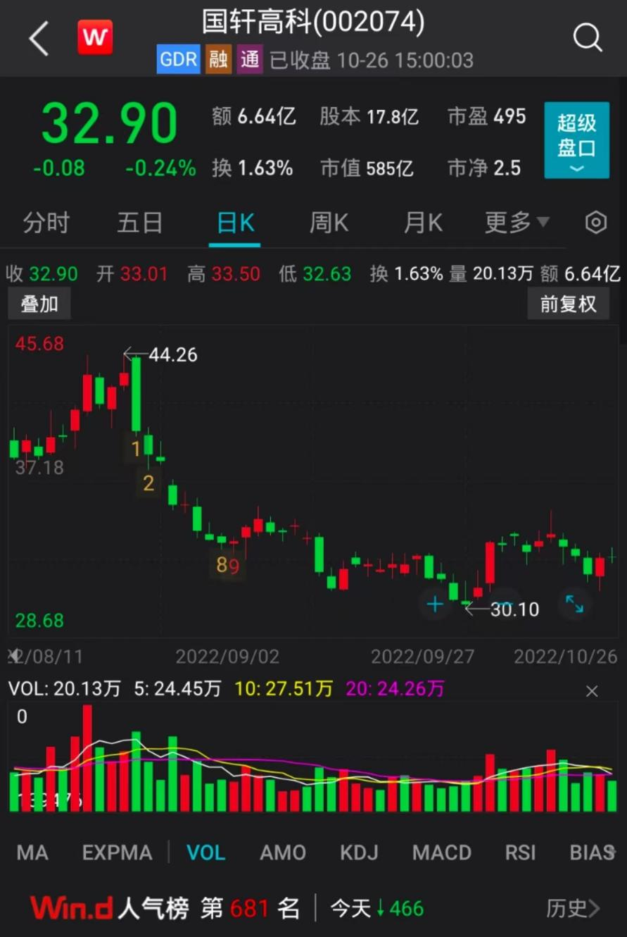 10月26日收盘,国轩高科股价报32.9元/股,市值585亿元。